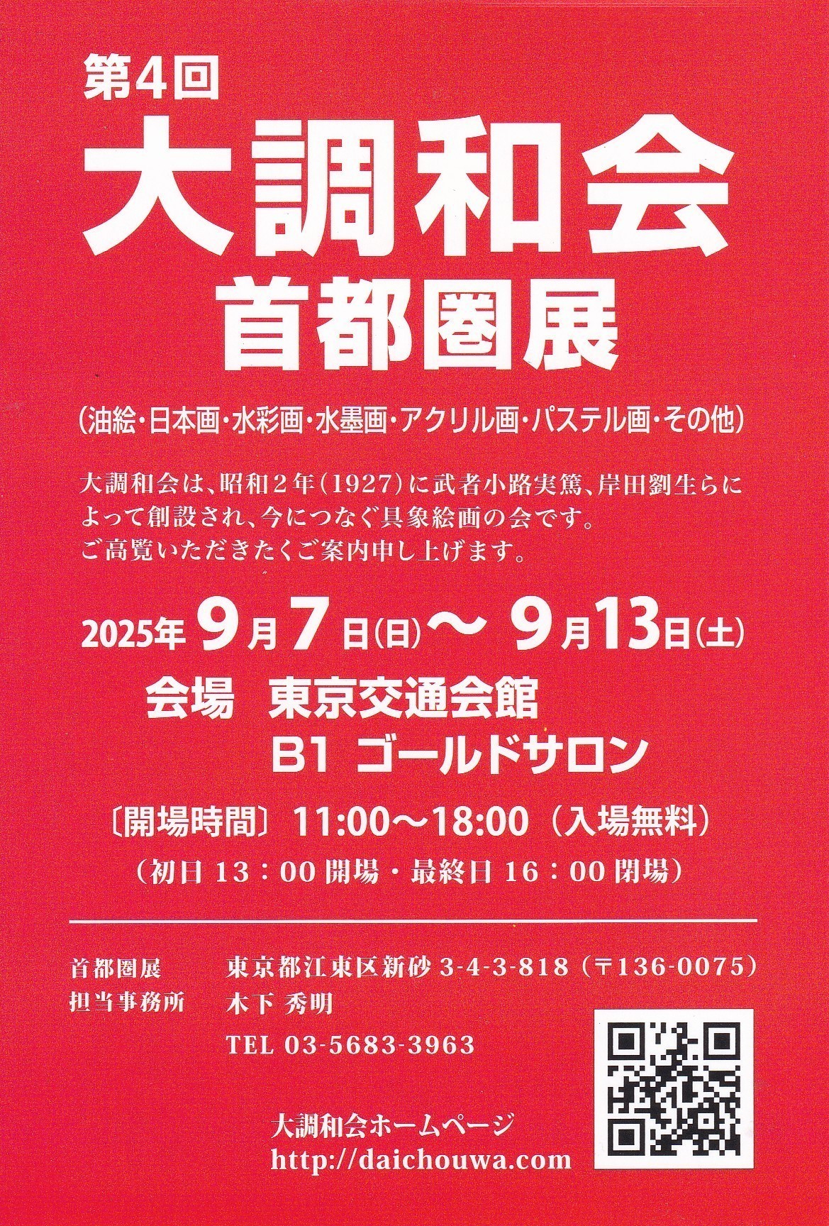 ■ 第4回 大調和会・首都圏展 ・開催 受賞式は9月13日(土)午後3時より行います。 作品総数:73点 ■受賞者 ・優秀賞 鈴木 崇夫 民族衣装 ・優秀賞 橋本 幸治 アンスリウム ・優秀賞 吉村 周子 HARUKA ・奨励賞 大竹 節子 思い出の中で ・奨励賞 小林 明夫 壁面の静物 ・奨励賞 酒井 寿雄 初冬の街角 ・奨励賞 佐藤 正章 真夏の杜